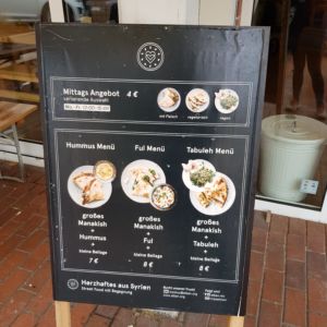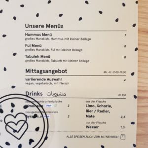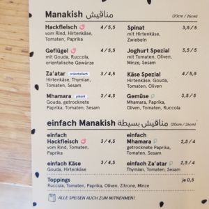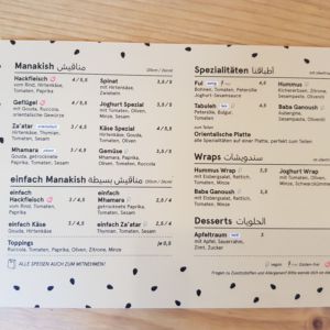 Das einfache Fladenbrot Manakish dominiert die Speisekarte – in allen denkbaren Varianten. Der Teigfladen ähnelt einer Pizza und wird mit wahlweise Hirtenkäse, Gouda, Gemüse, Tomaten und mehr belegt und entsprechend gewürzt. Es gibt sie in klein und groß oder im Menü mit wahlweise Hummus oder Tabuleh. Ein spezielles Mittagsmenü wird zwischen 12 und 15 Uhr ebenfalls angeboten.