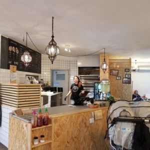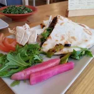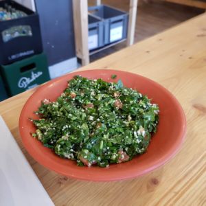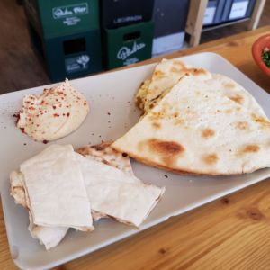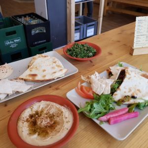 Wir waren an einem Donnerstag Mittag gegen 13 Uhr hier. Wir bestellten am Tresen und saßen uns an einen der langen Tische. Wir bekamen jeweils ein Menü: Einmal den Seitan-Käse-Manakish (Tages-Special) mit Tabouleh und den Gemüse-Manakish mit Hummus.