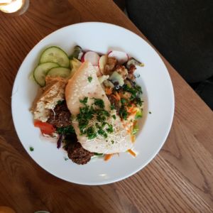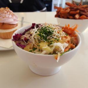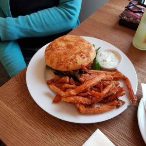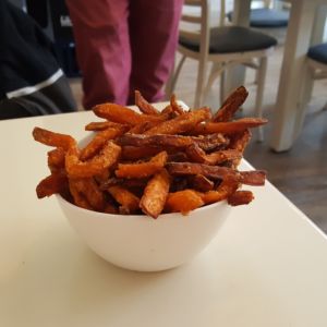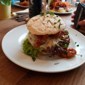 Ich war jetzt schon zwei mal im Krawummel. Einmal an einem Sonntag Mittag gegen 13 Uhr für einen kleiner Snack. Da bestellten wir einen Salat, Süßkartoffelpommes und einen Cupcake. Beim zweiten Mal gab es den orange county Burger, den classick burger, einmal den Krawummel und einmal den Falafel Teller.