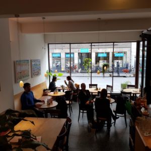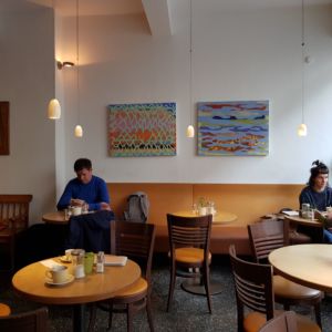 Wir waren an einem Samstag Mittag gegen 15 Uhr für ein Mittagessen hier. Wir saßen uns an einen der freien Tische im vorderen Bereich und bestellten ein Weizen und eine Rhabarersaftschorle. Zum Essen entschieden wir uns für das Wochenendgericht Buchweizenchilada mit Spinat und Salat und das Saisongericht Rote-Beete-Kartoffel-Gratin.