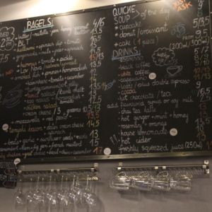 Wir sind zum Frühstücken ins Cafe Central gegangen, gleich um 9:00 als es aufmachte. An der Wand hängt die recht große Karte, bestellt wird am Tresen. Die Bagels werden frisch zubereitet. Wir bestellten einen Rosmarin-Organen-Tee, 2 Kaffes, einen frisch gepressten Grapefruit-Apfel-Saft, ein Rührei mit Petersilie und Zwiebeln und ein Bagel mit Halloumni, Spinat und Tomaten.